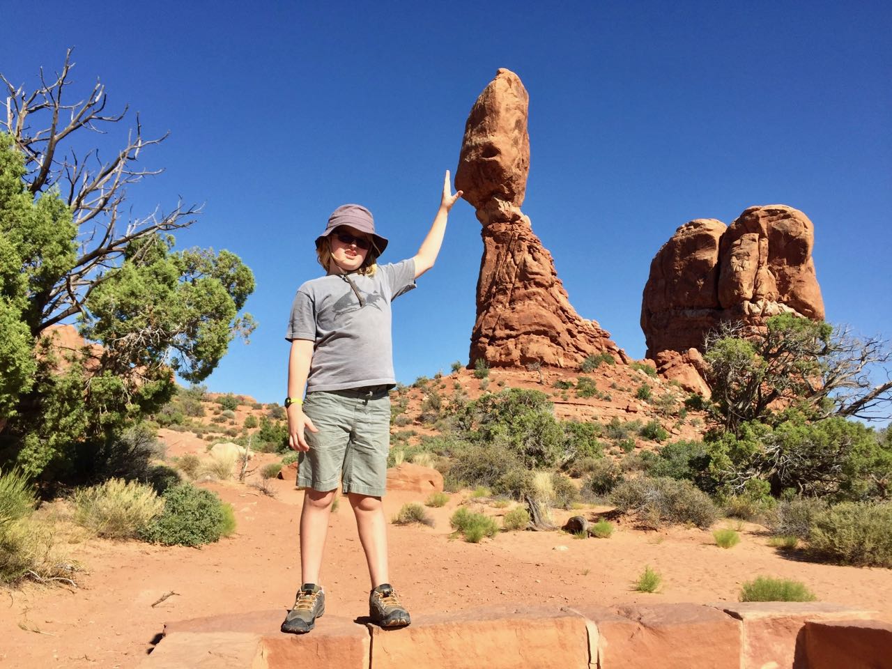 - Lachlan in a Silly Cliche Tourist Photo Op at Balanced Rock – Arches National Park